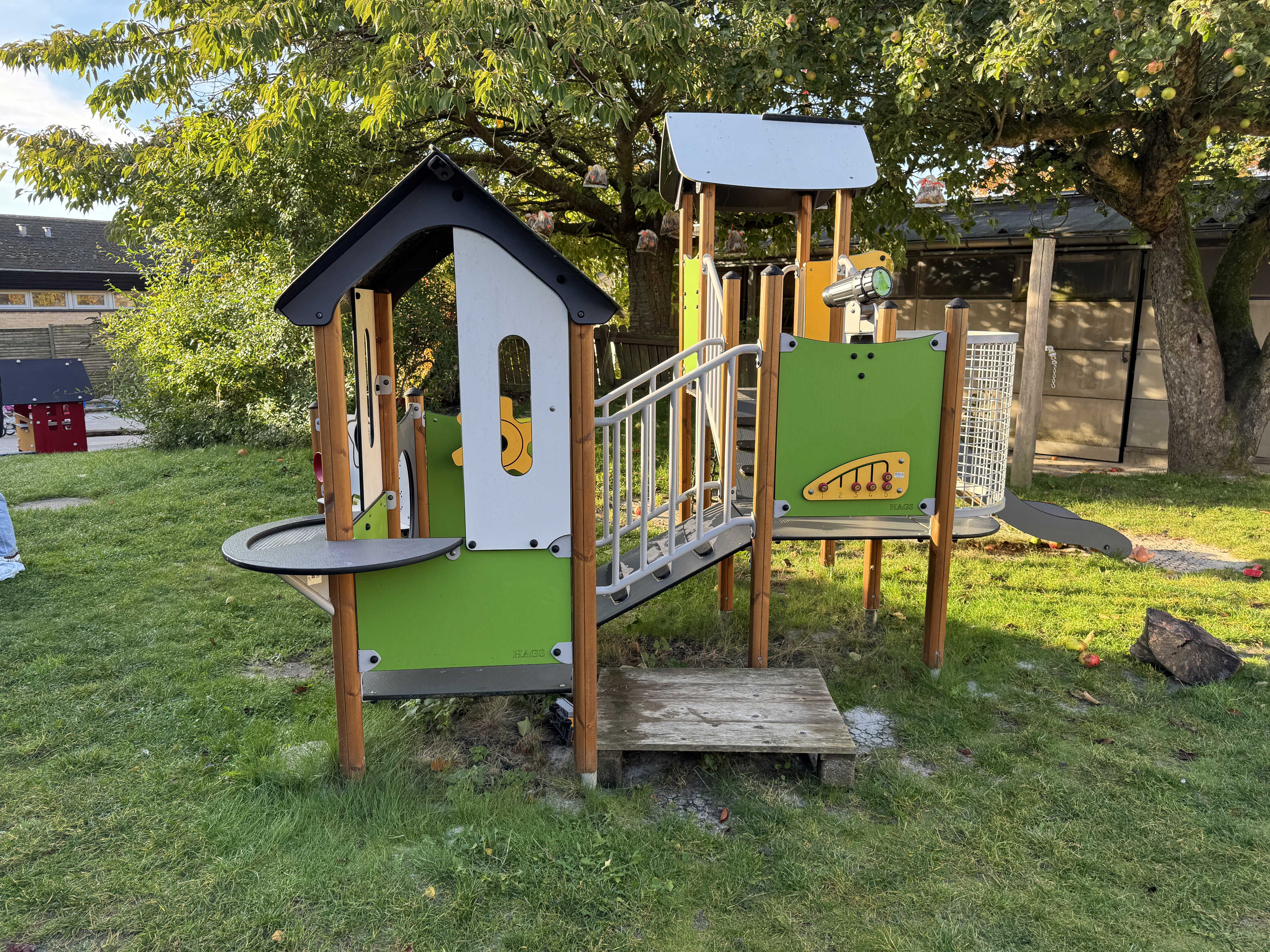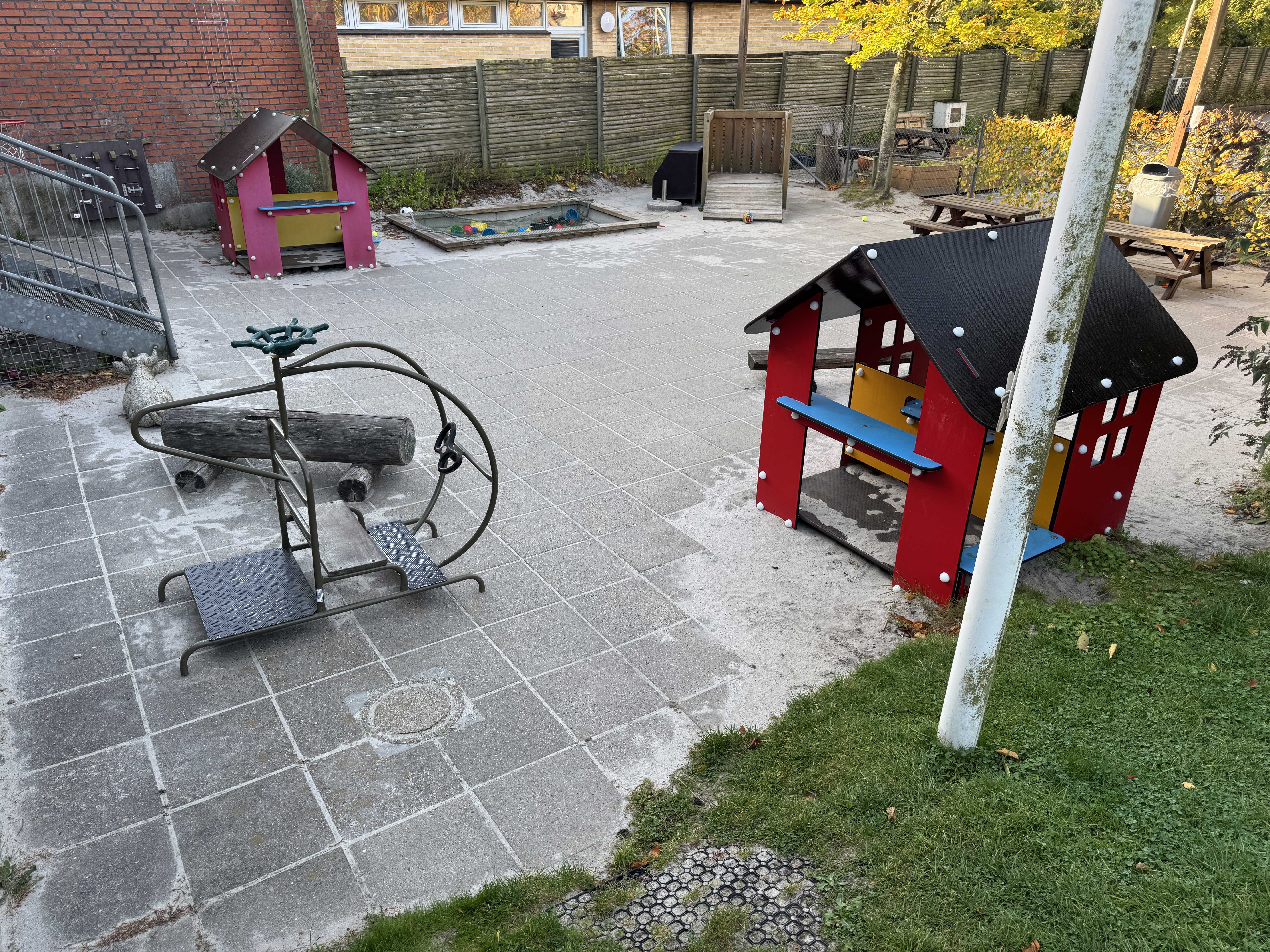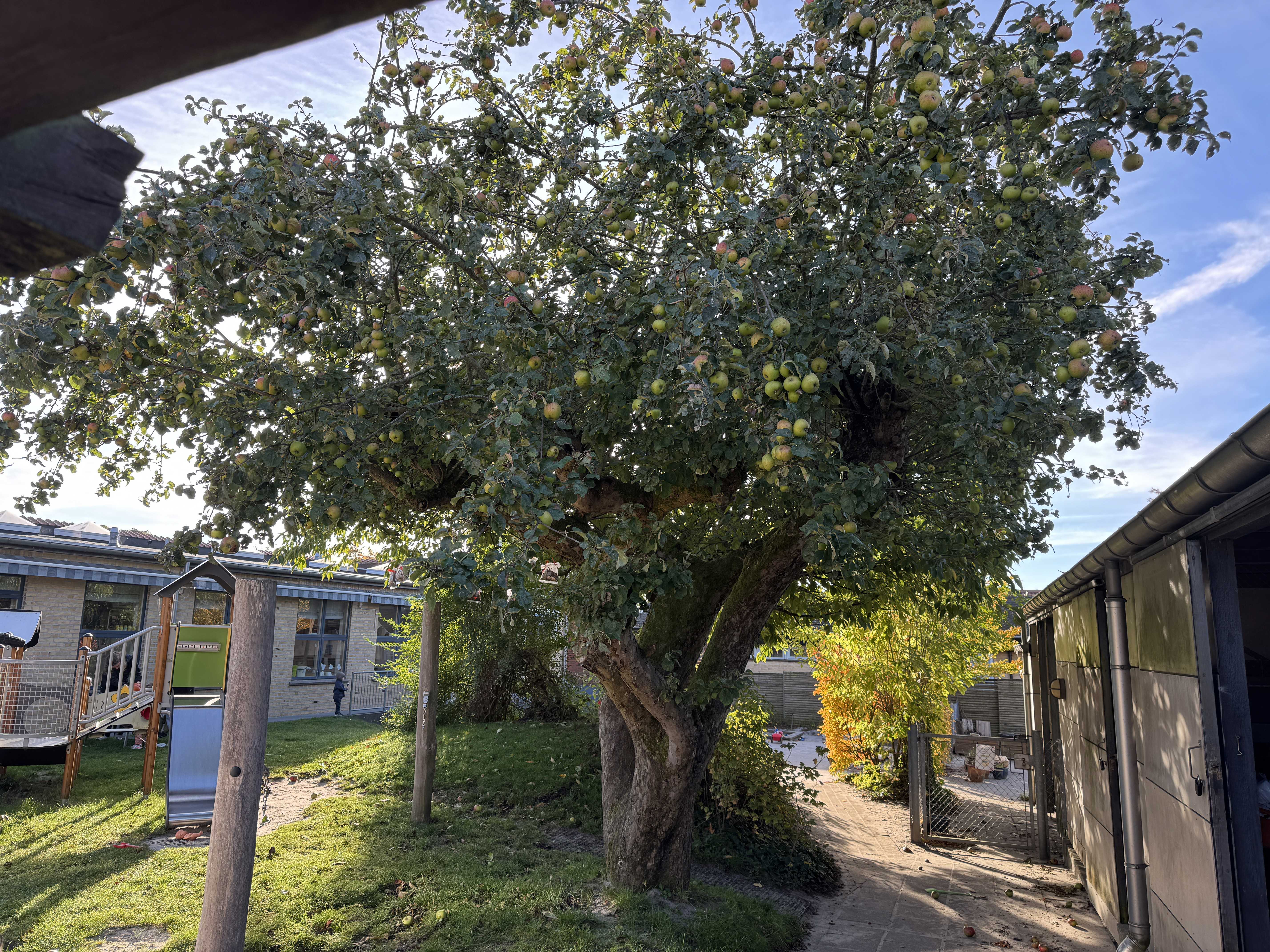 Legepladsen er forholdsvis lille, men vi synes selv, den er ganske udmærket. På legepladsen står ÆBLETRÆET, som er meget gammelt og meget stort og giver en masse skygge om sommeren.