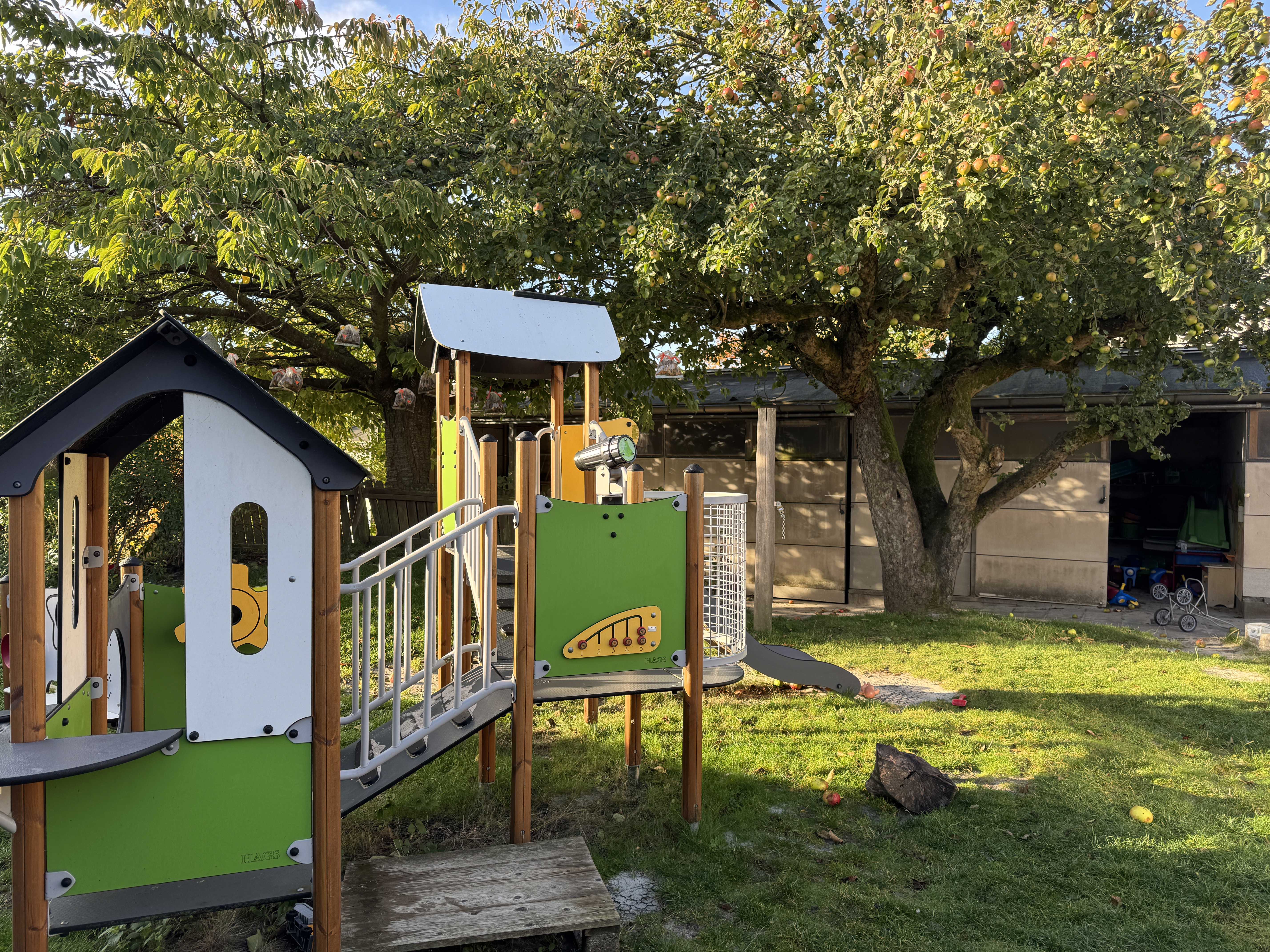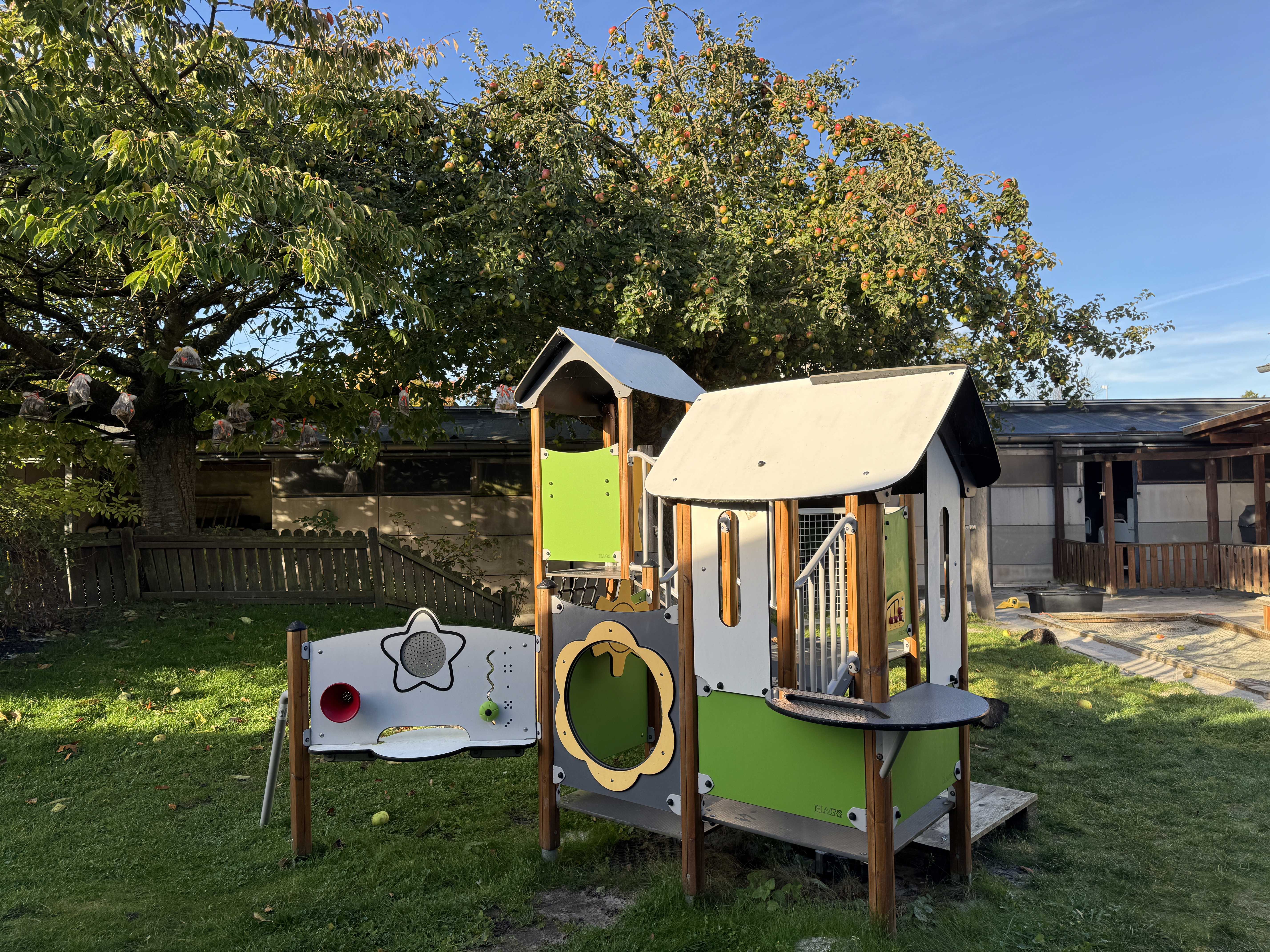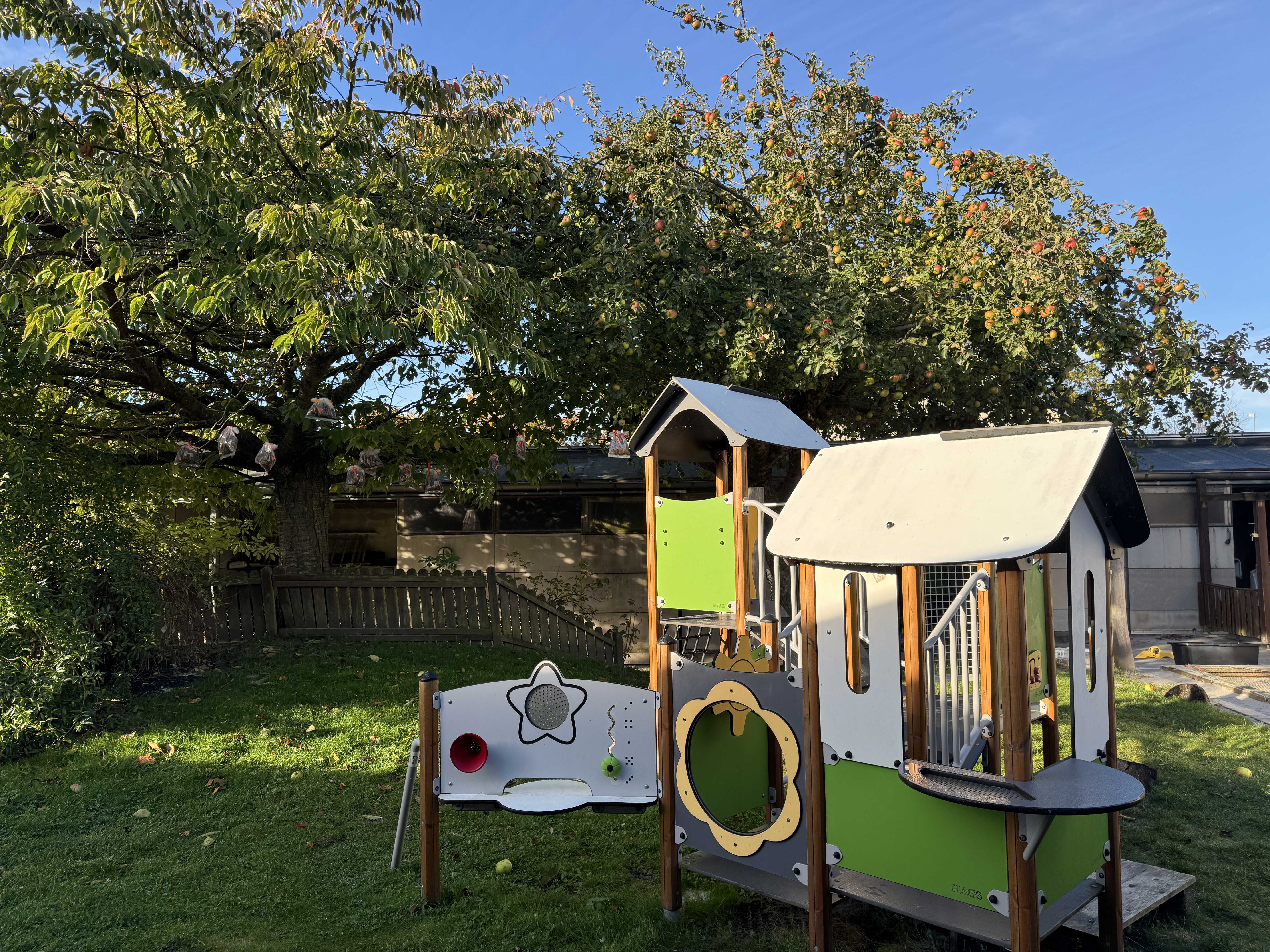 Legepladsen er forholdsvis lille, men vi synes selv, den er ganske udmærket. På legepladsen står ÆBLETRÆET, som er meget gammelt og meget stort og giver en masse skygge om sommeren.