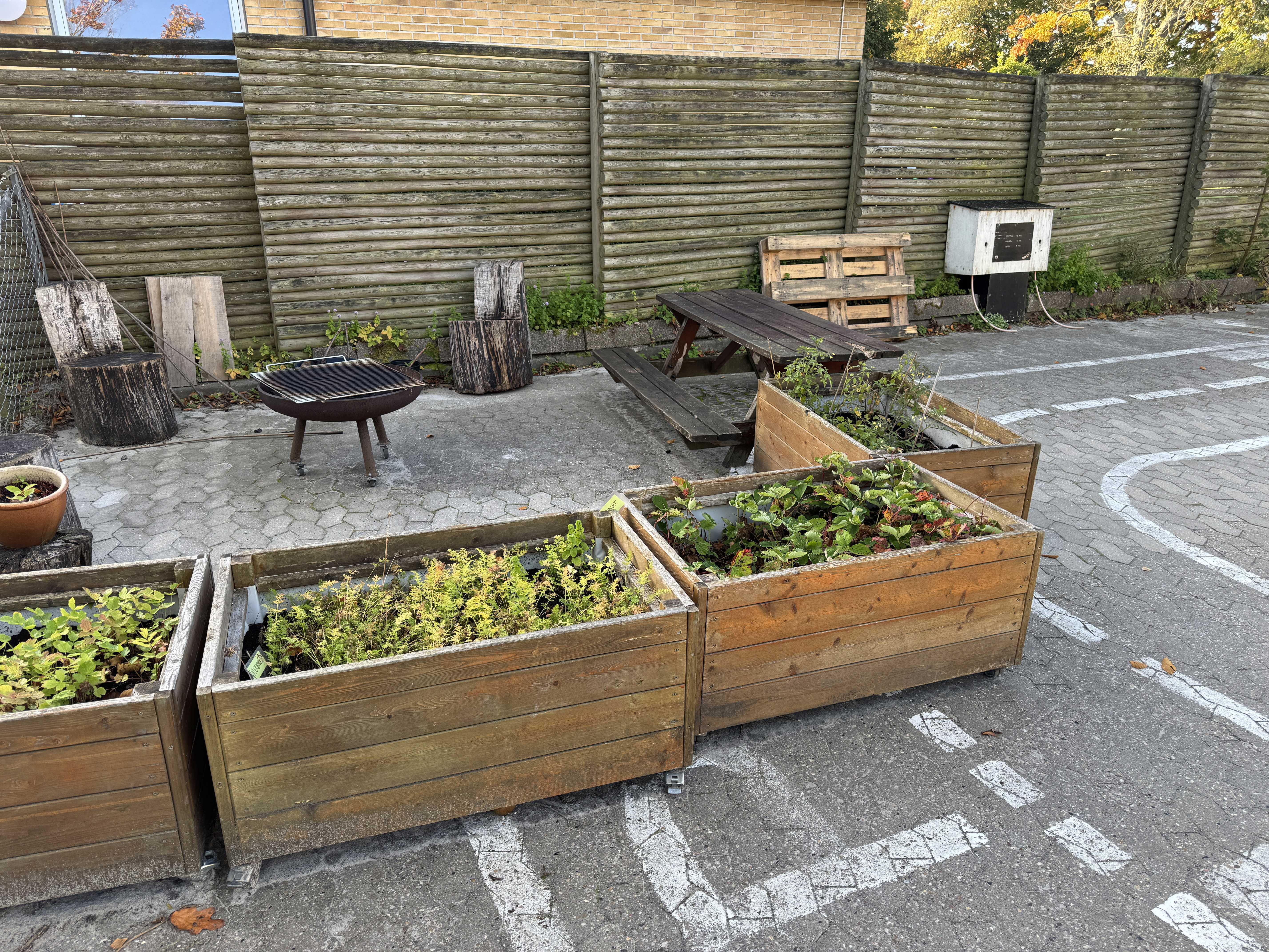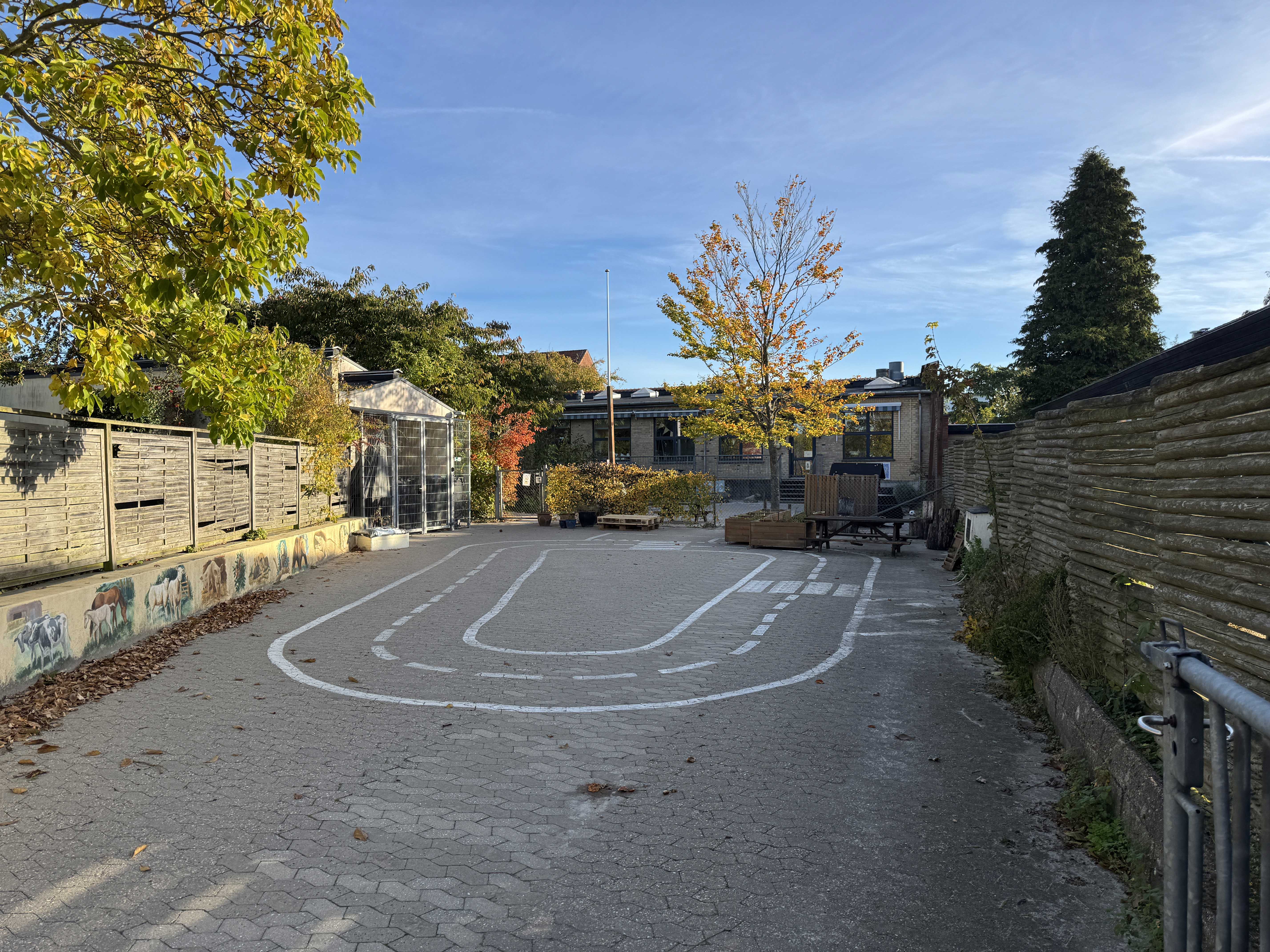 På grund af legepladsens størrelse, har vi valgt at få sat en låge op, så vi kan bruge parkeringspladsen til at cykle og løbe på - det giver os en masse ekstra plads.