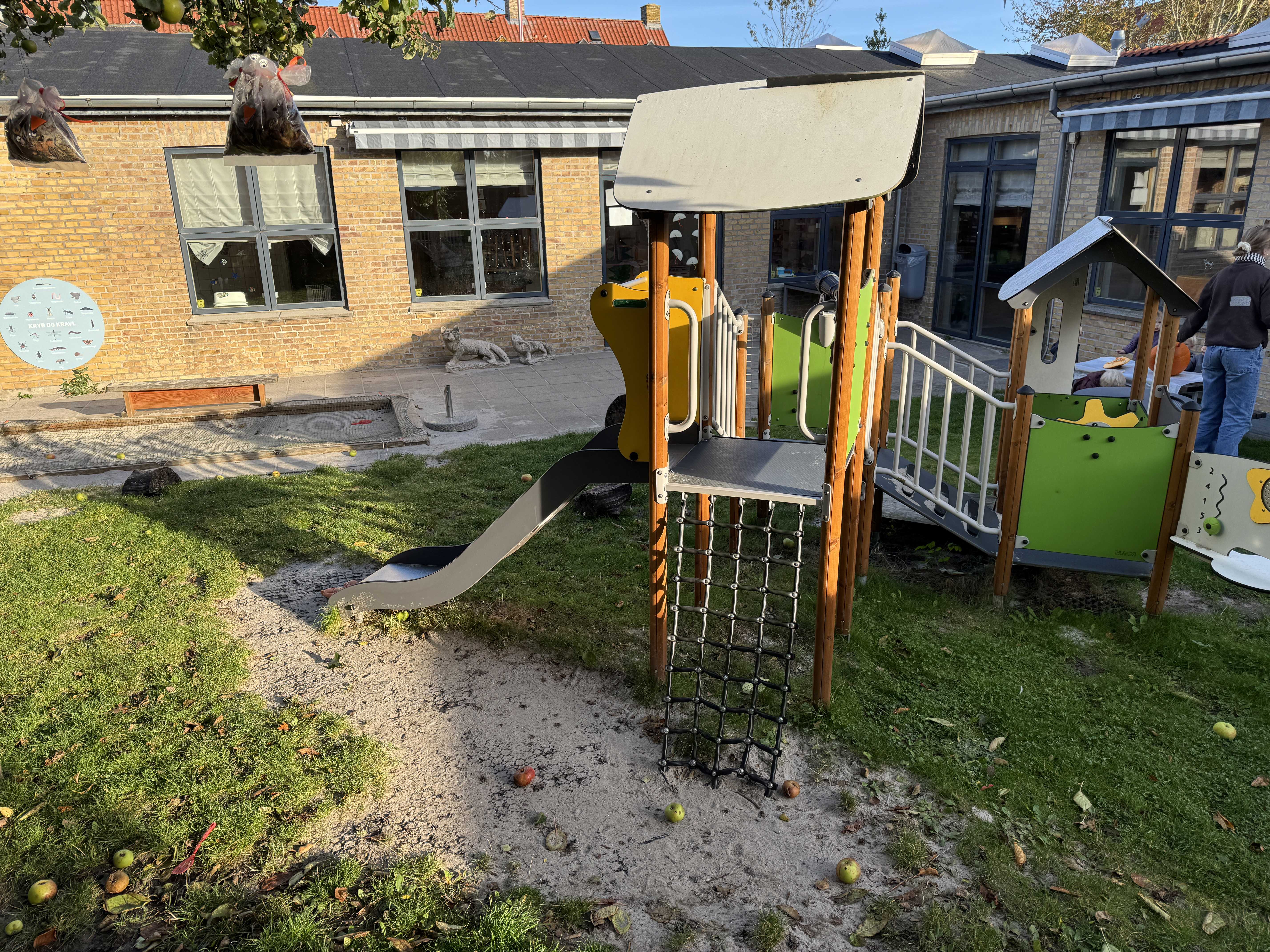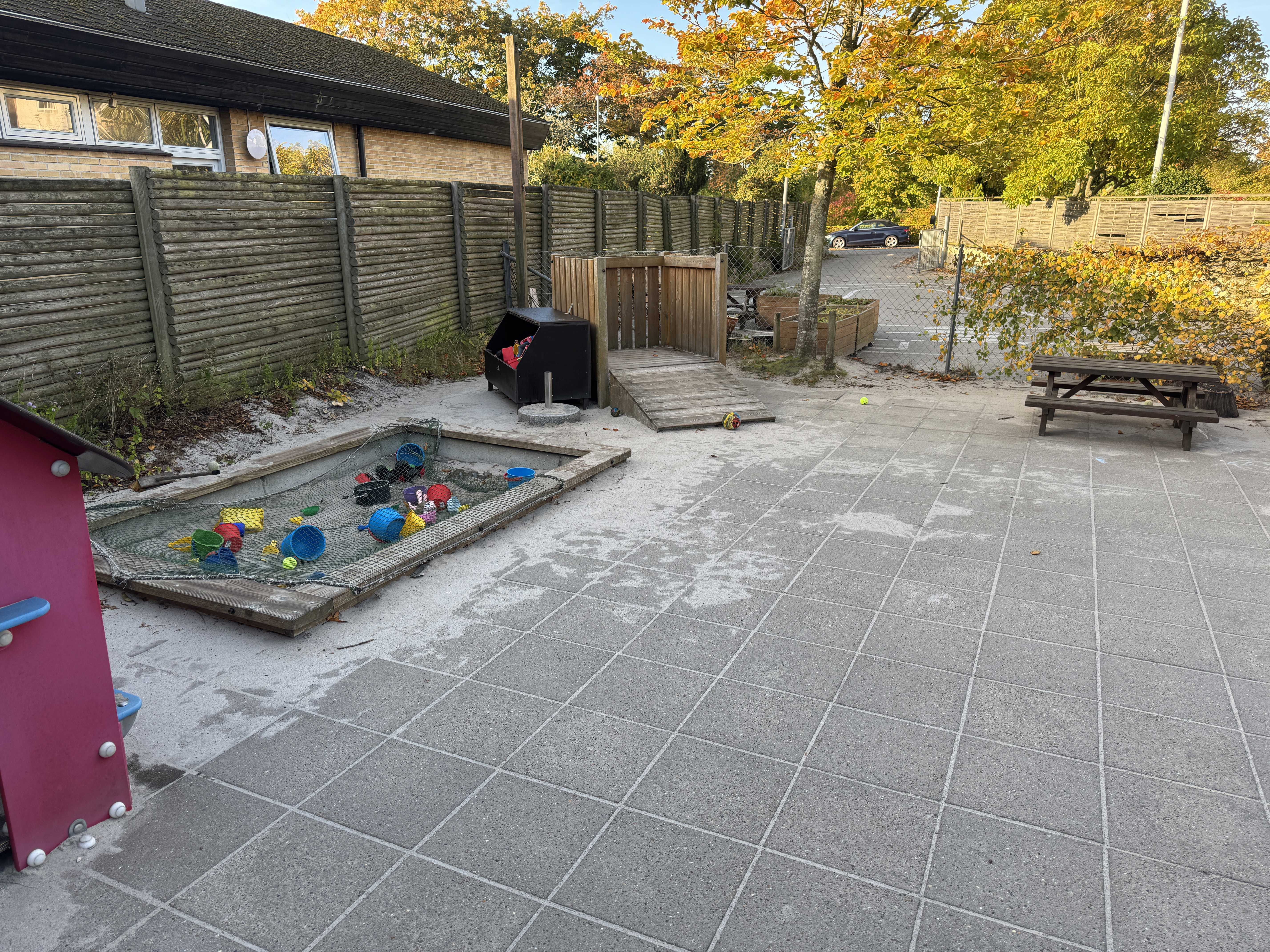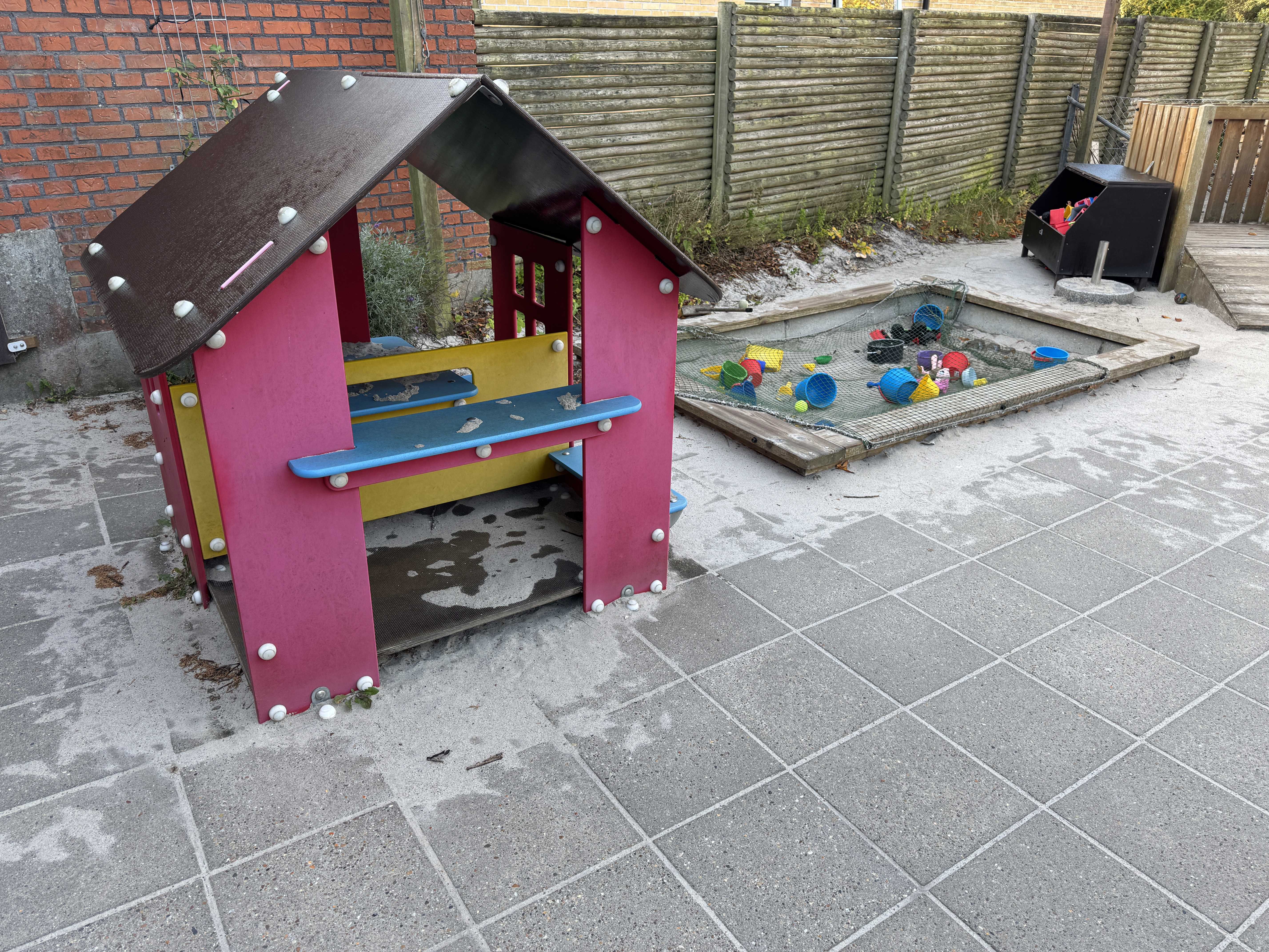 Vi har gode muligheder på vores legeplads, selvom den ikke er så stor. Der leges med sandet i (og udenfor) sandkasserne, køres på "scootere", kastes med bolde og bliver gået og løbet en hel del på både fliser, græs og bakke. Og så er der jo altid chancen for at komme på en tur enten på gå-ben, i klapvogn eller en tur i vores elcykler evt. op i parken for at gynge eller vippe.