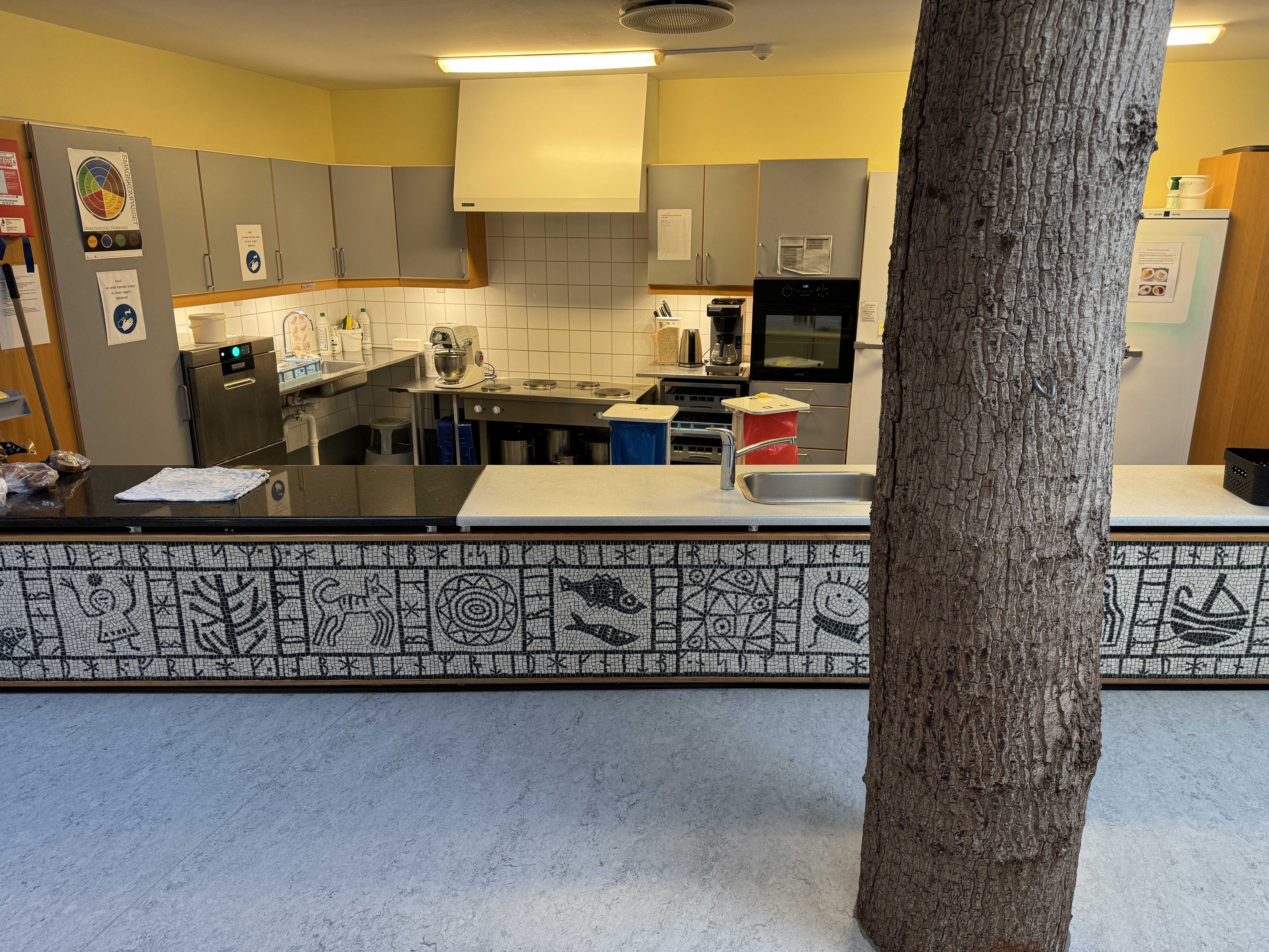 Vi har masser af vinduer og ovenlys, så huset er meget lyst og venligt, hvilket vi holder meget af. Midt i huset har vi et åbent køkken/alrum, hvor vores køkkendame arbejder i et forsænket køkken. Børnene har så mulighed for at stå på den anden side af køkkenbordet og følge med eller hjælpe til.